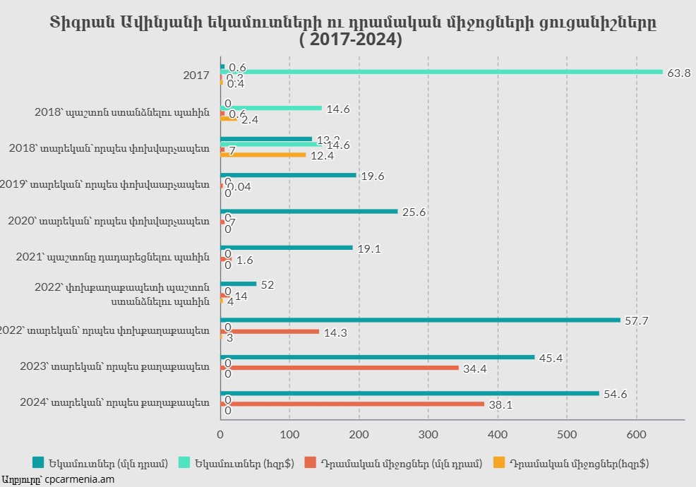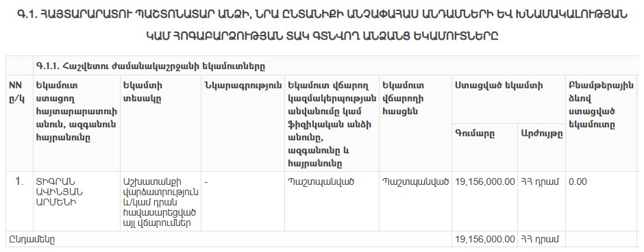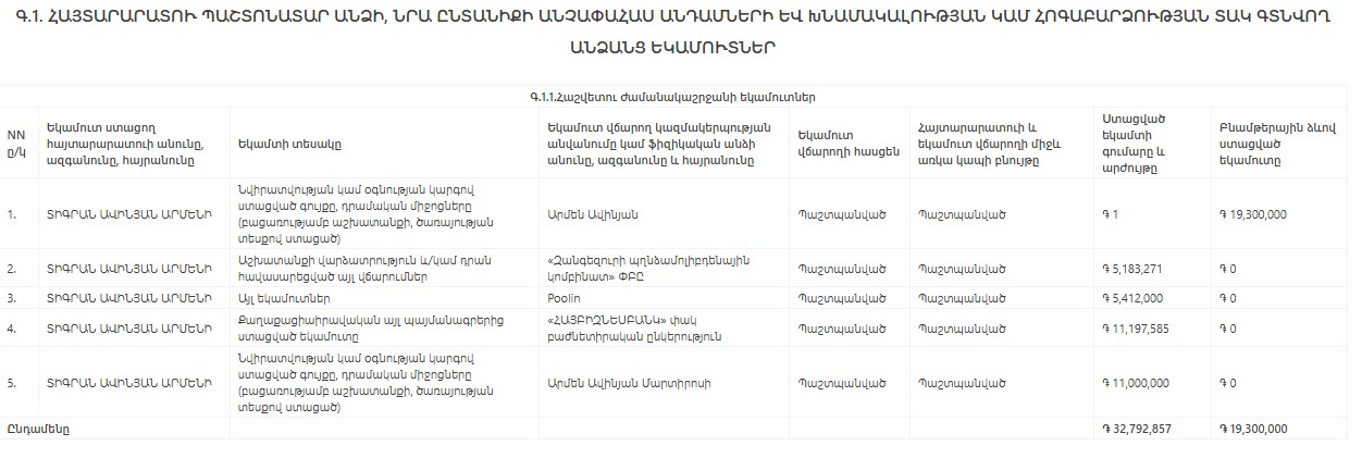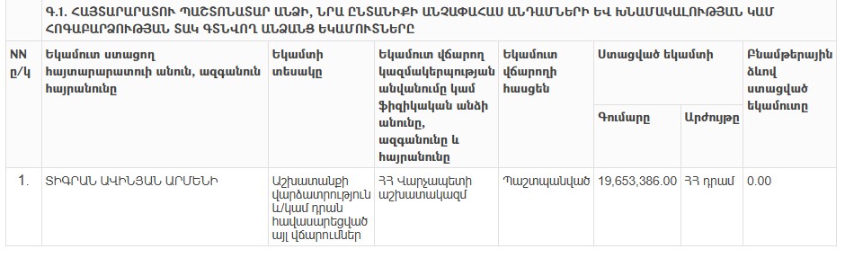 Չնայած վերջին մեկ տարում որպես եկամուտ հայտարարագրված խոշոր գումարին, դրա միայն մի փոքր մասը՝ 693 հզր դրամն է ներկայացված որպես աշխատավարձ, որը ստացվել է հայաստանյան «ՇՏԸ» ՍՊԸ-ից։