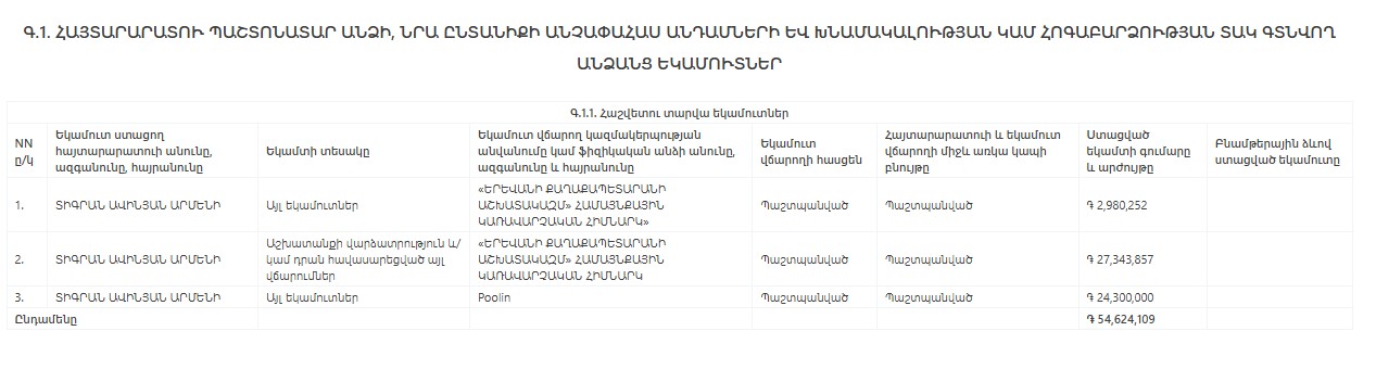 Ընդ որում, գրանցված եկամտից 14 մլն դրամը գոյացել է որպես անշարժ գույք հայտարարագրված ավտոտնակը (տրանսպորտային միջոցների կայանման համար հողամասի վրա կառուցված առանձին շինությունը, ավտոհանգրվանը, ավտոկայանատեղին) օտարելու արդյունքում։