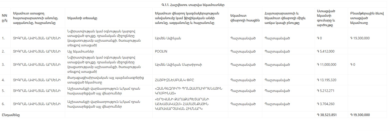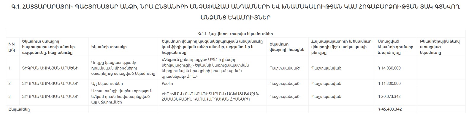 2023 թվականի տարեկան հայտարարագրով Երևանի քաղաքապետի պաշտոնավարումը (պաշտոնը ստանձնման ամսաթիվը՝ 10․10․2023թ.) շարունակող Տ․ Ավինյանի