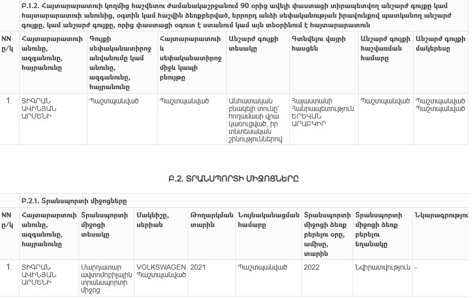 Այս հայտարարագիրը հնարավորություն է տալիս տեսնել ոչ միայն անշարժ գույքի առկայությունը, այլ նաև այն ձեռք բերելու ժամկետն ու եղանակը։ Ըստ այդմ, որպես նախկինում ներկայացված ավտոտնակի (կից տրանսպորտային միջոցների կայանման համար հողամասի վրա կառուցված առանձին շինություն, ավտոհանգրվան, ավտոկայանատեղի) ձեռք բերման ժամկետ նշված է 2014 թվականը, իսկ եղանակը՝ նվիրատվություն։ Թե ով է նվիրատուն, նշված չէ։