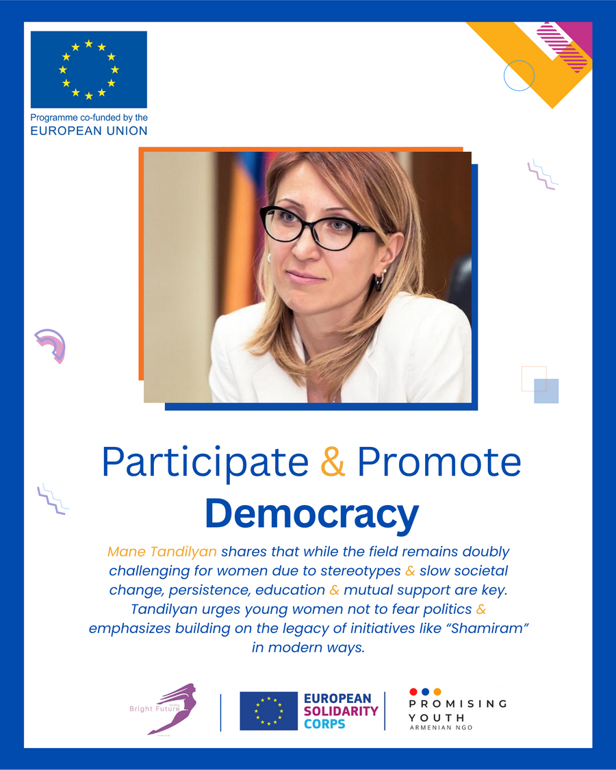 Երիտասարդ աղջիկներին քաղաքականությունը, որպես իրական հնարավորություն ներկայացնելու համար, Թանդիլյանը ազնիվ է. «Քաղաքականության մեջ կանայք ամեն օր պայքարում են լսված լինելու համար։ Դա հեշտ ճանապարհ չէ, բայց հենց այստեղ է հնարավոր իրական փոփոխություն բերել», – ասում է նա՝ հորդորելով երիտասարդ աղջիկներին չվախենալ և պայքարել իրենց ձայնը հնչեցնելու համար։